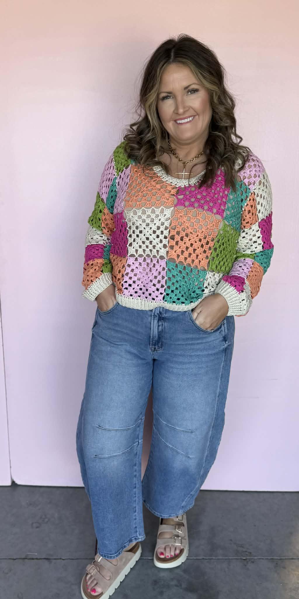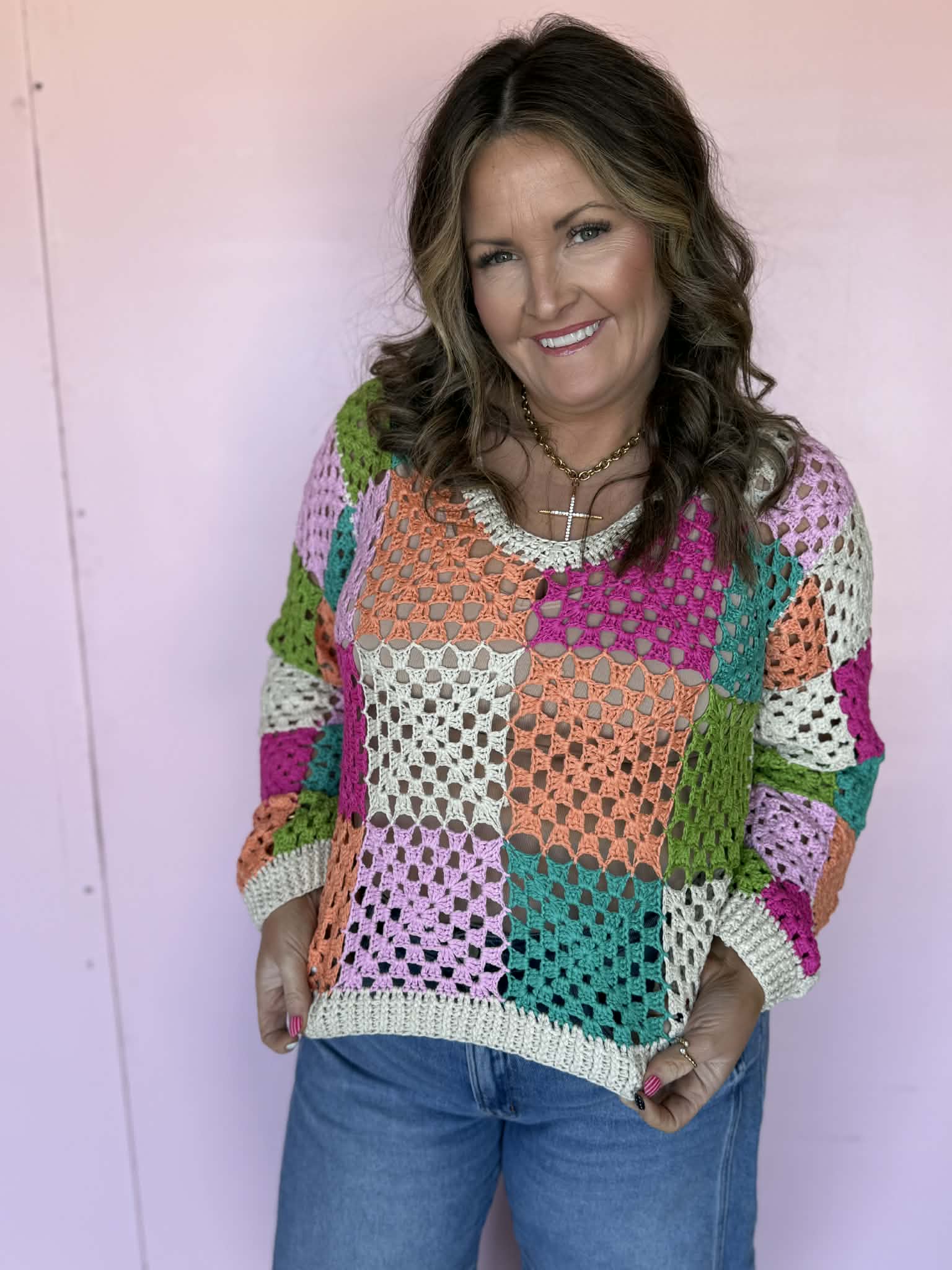 Bring the color wherever you go in this eye-catching patchwork crochet sweater. Designed with a relaxed fit and breathable open knit, this piece features a playful mix of vibrant squares that give it a handmade, vintage-inspired feel while still looking effortlessly modern.