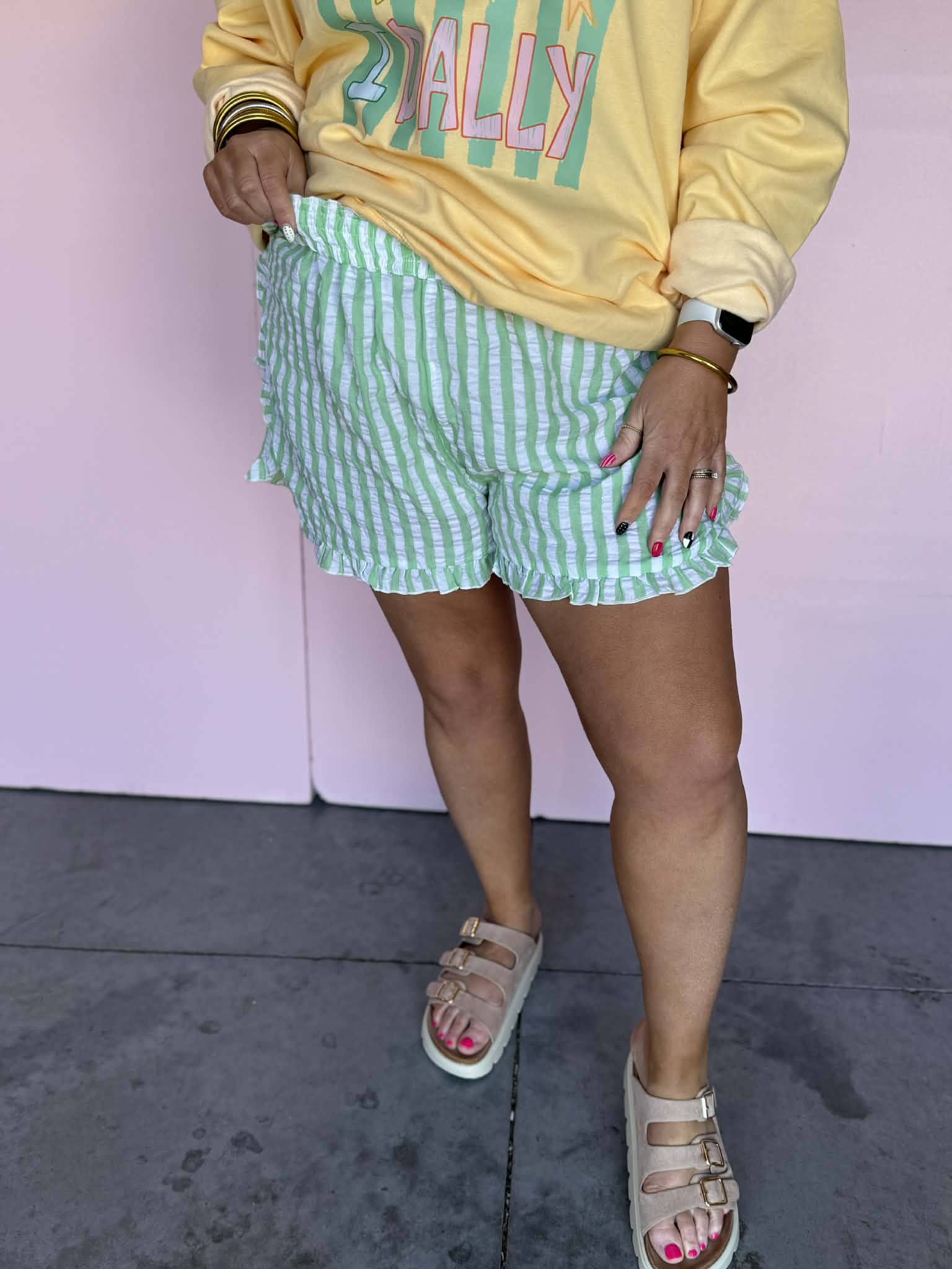 These green and ivory striped shorts are lightweight, comfy, and just the right amount of playful. Designed with an elastic waistband for an easy pull-on fit and finished with a soft ruffle hem that adds a feminine touch. Whether youâre lounging at home, running errands, or pairing them with a tank for brunch, these shorts are effortless and cute every time.