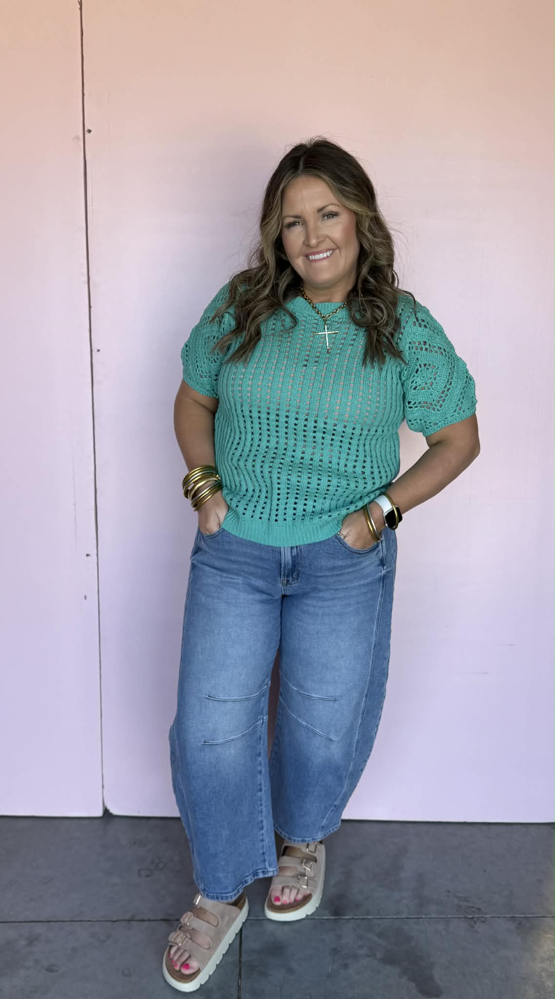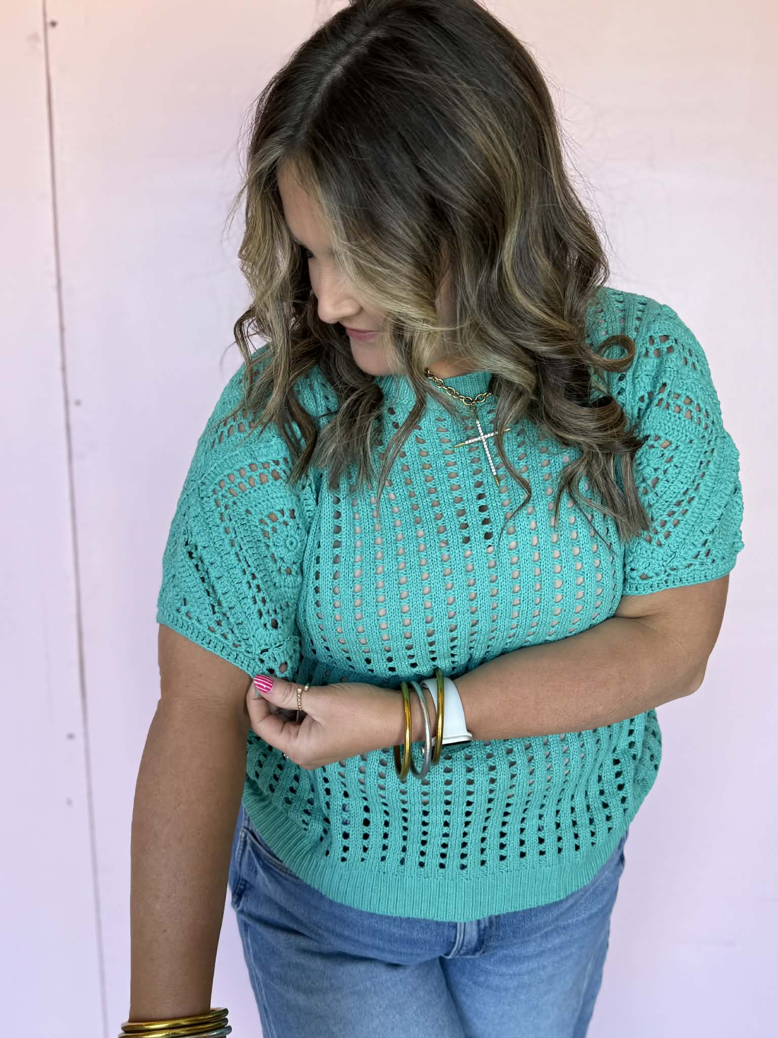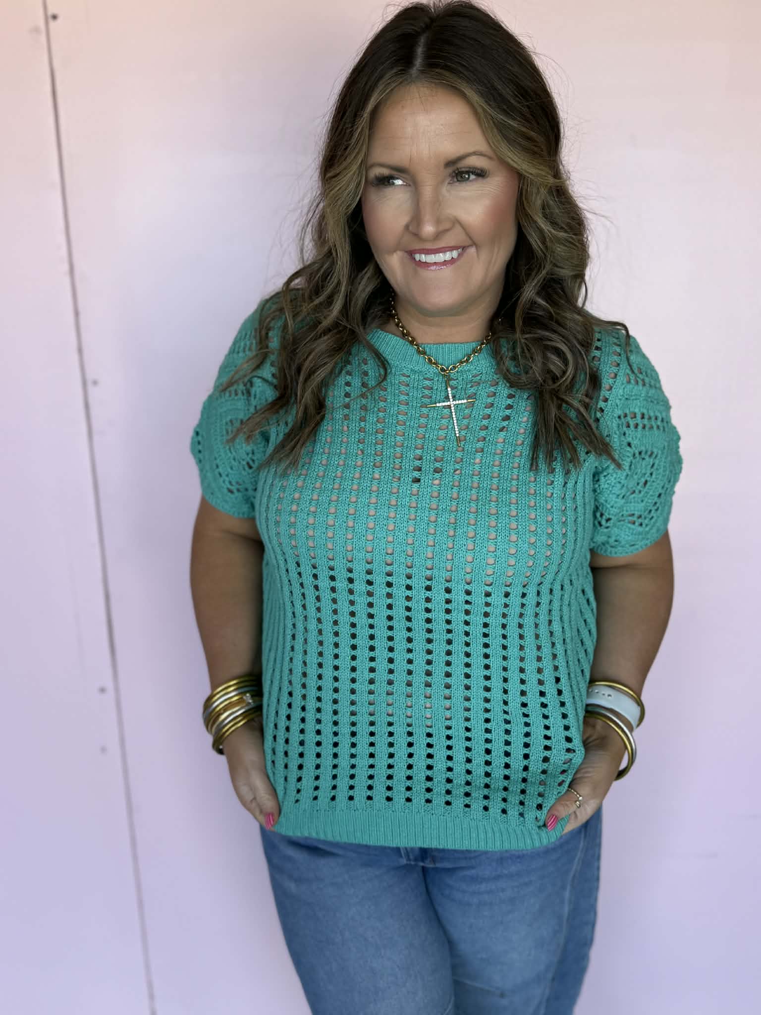 A fresh pop of color your spring wardrobe needs. This lightweight open knit sweater tee features a breathable crochet design, relaxed fit, and short sleeves that make it perfect for transitional styling and warm weather layering.