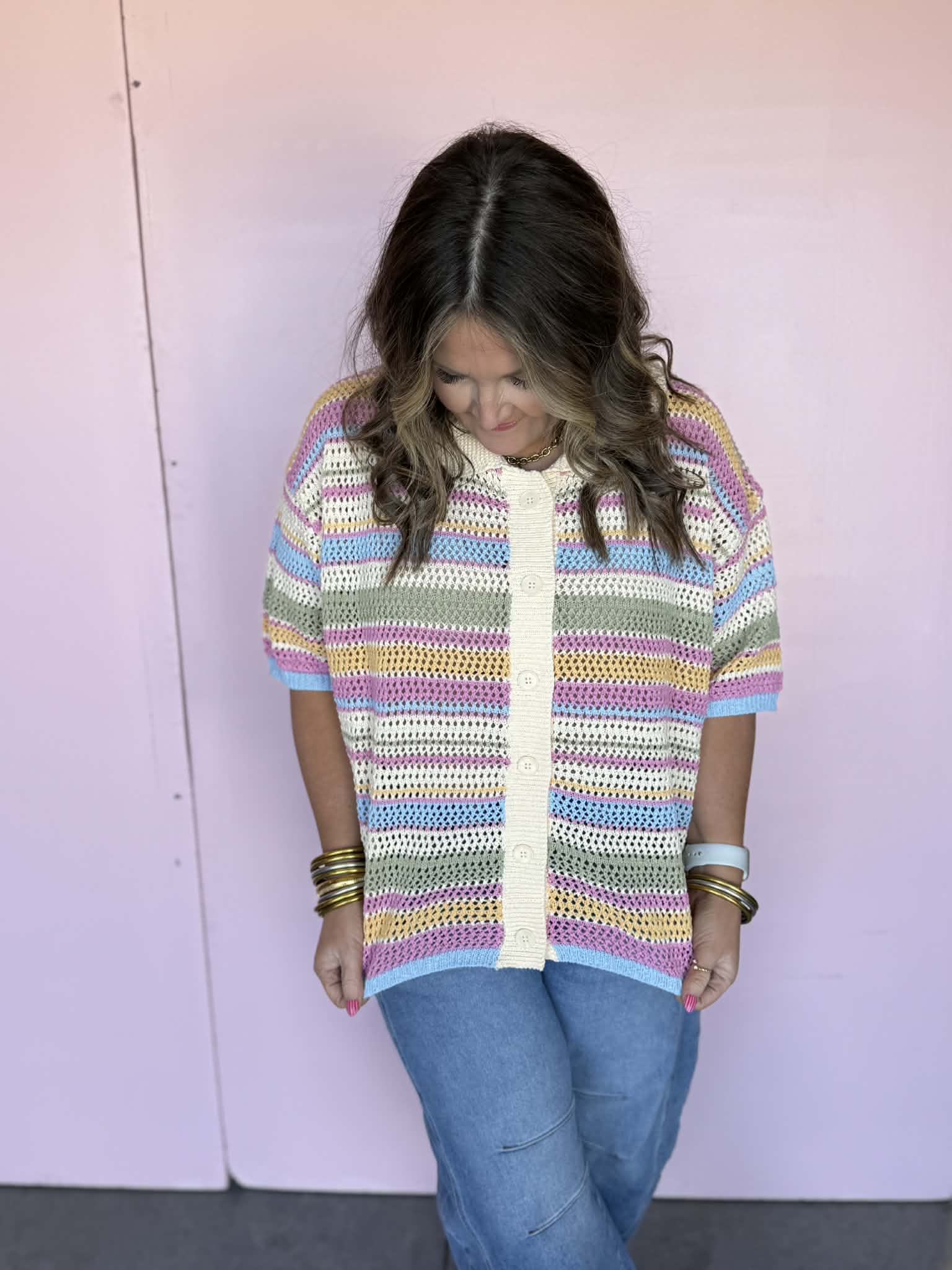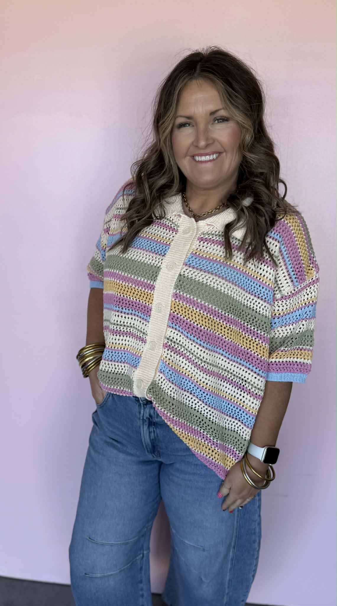 Meet your new go-to for effortless spring style. This lightweight crochet cardigan features soft pastel stripes, a relaxed silhouette, and functional button-front detail for versatile styling. The breathable knit makes it perfect for layering now and wearing solo when warmer days arrive.
