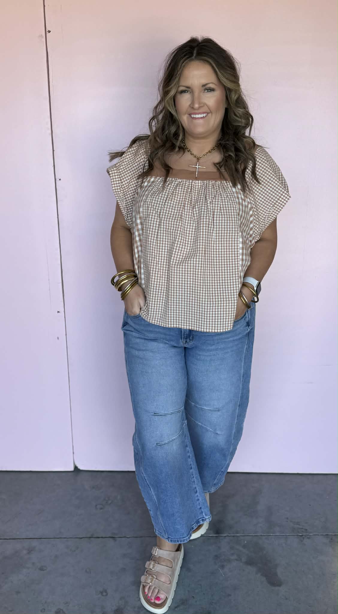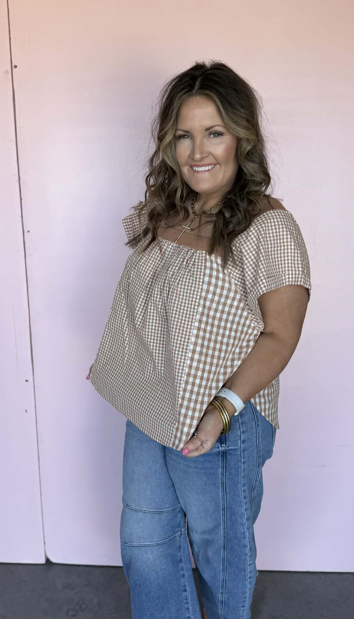 A timeless piece you’ll reach for again and again. This gingham blouse features a soft neutral check pattern, relaxed silhouette, and feminine square neckline that creates an effortlessly polished look.