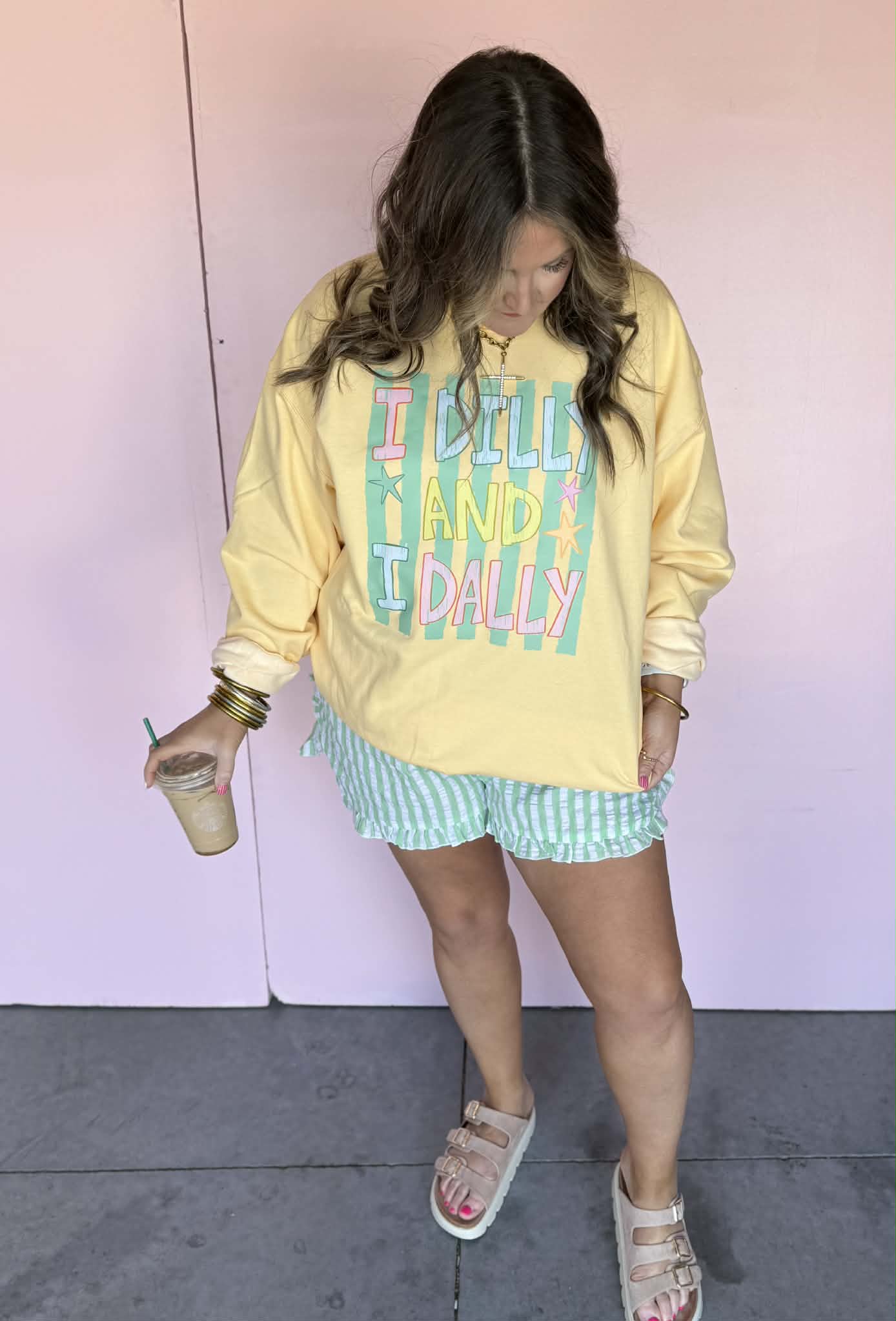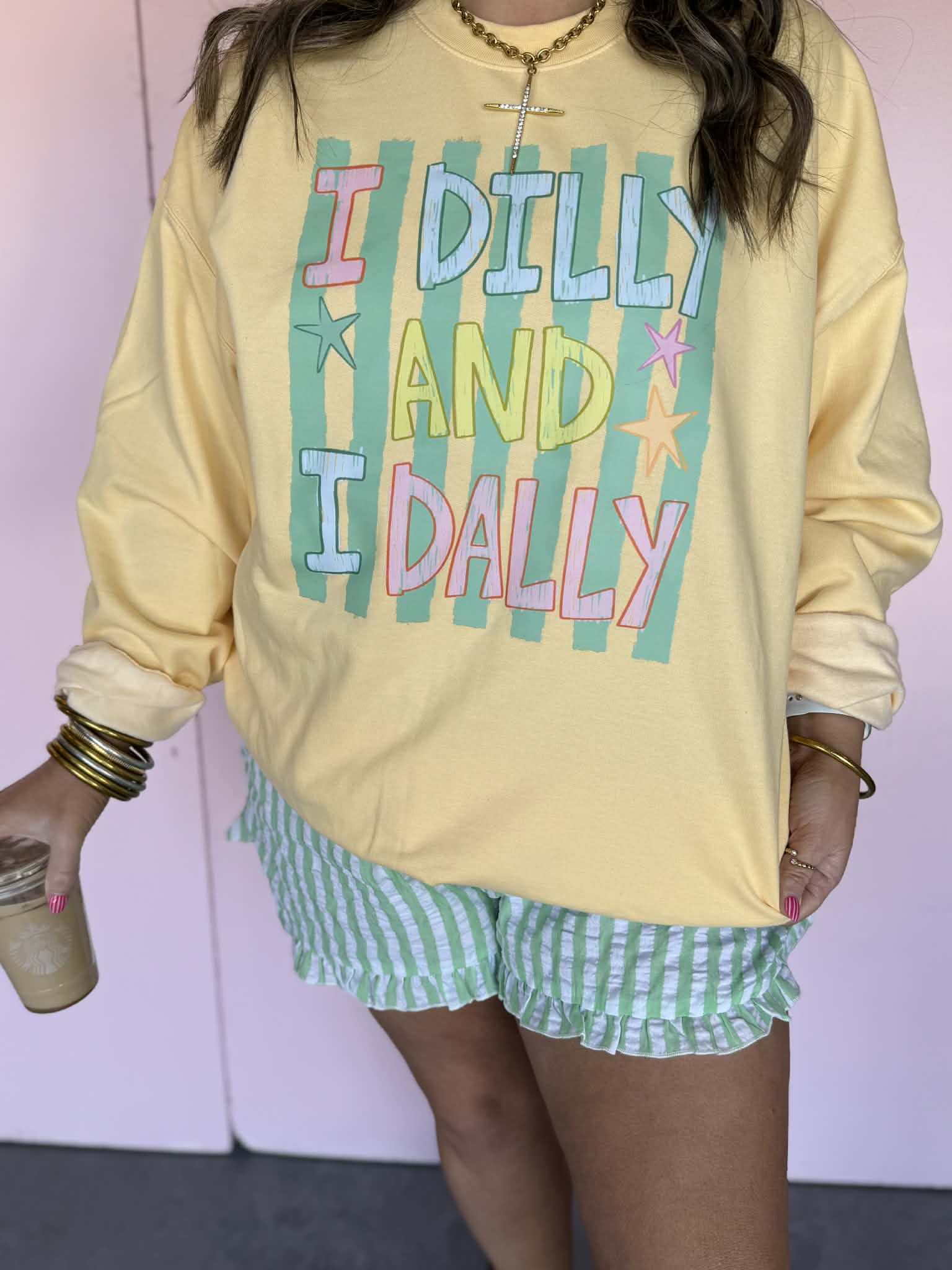 we all just need to dilly dally a little bit. ;) printed on a butter yellow unisex crewneck