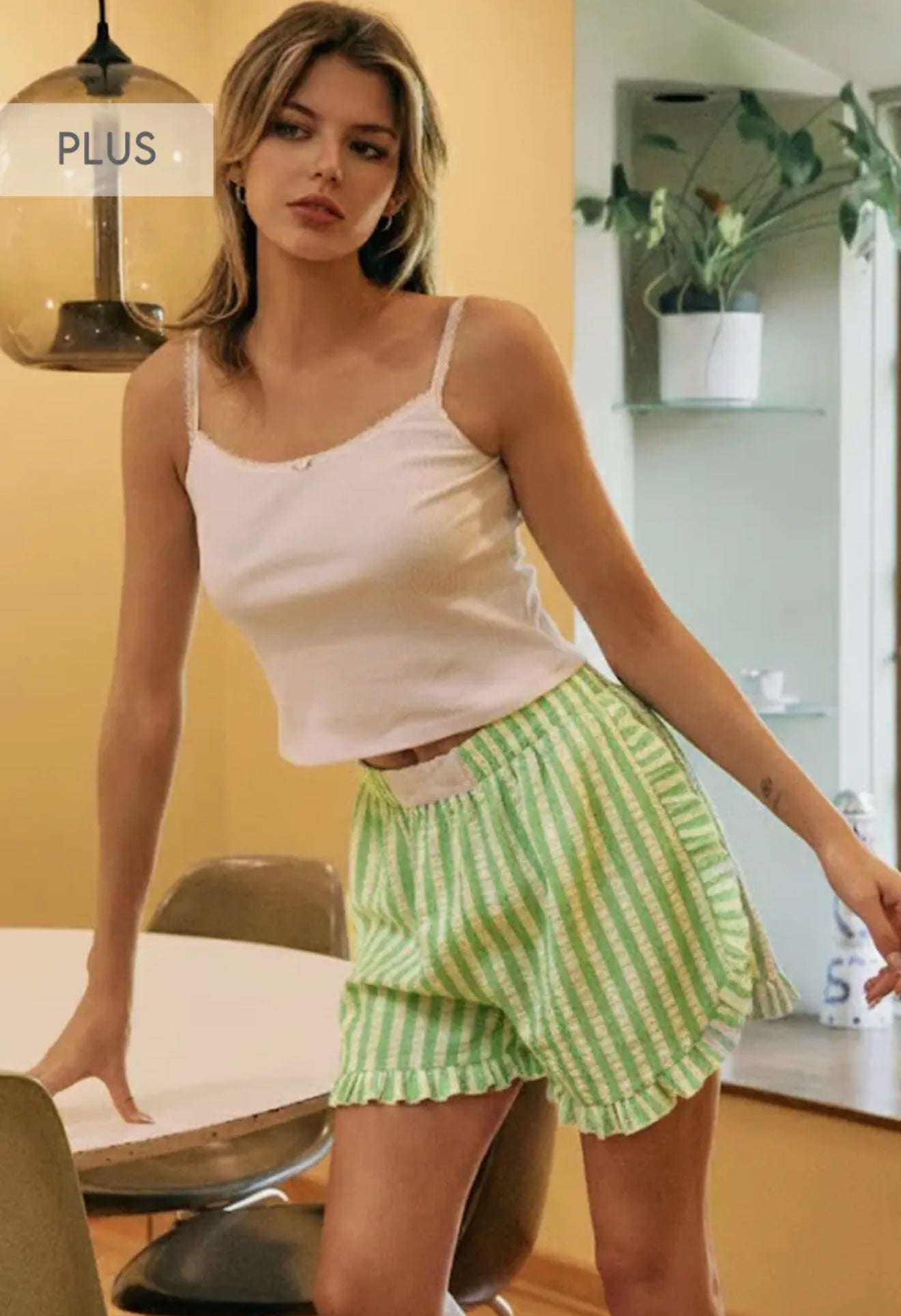 These green and ivory striped shorts are lightweight, comfy, and just the right amount of playful. Designed with an elastic waistband for an easy pull-on fit and finished with a soft ruffle hem that adds a feminine touch. Whether youâre lounging at home, running errands, or pairing them with a tank for brunch, these shorts are effortless and cute every time.